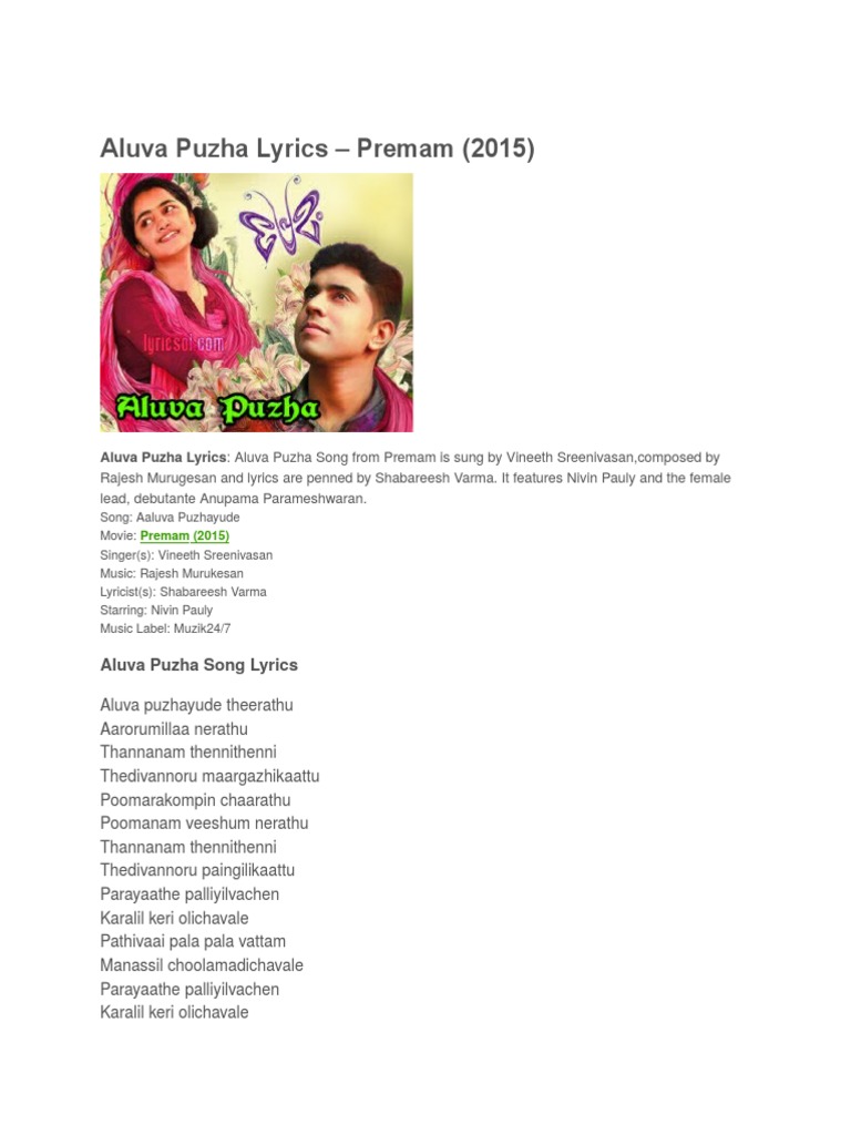Aluva Puzhayude Theerathu Lyrics In Malayalam / chorus dm aluva puzhayude theerathu dm aarorumillaa nerathu dm thannanam thennithenni dm thedivannoru maargazhikaattu dm poomarakompin chaarathu dm helen, helen(2019), malayalam, prarthana indrajith, shaan rahman, vineeth sreenivasan. Aluva Puzhayude Theerathu Lyrics In Malayalam - Comment must not exceed 1000 characters.
